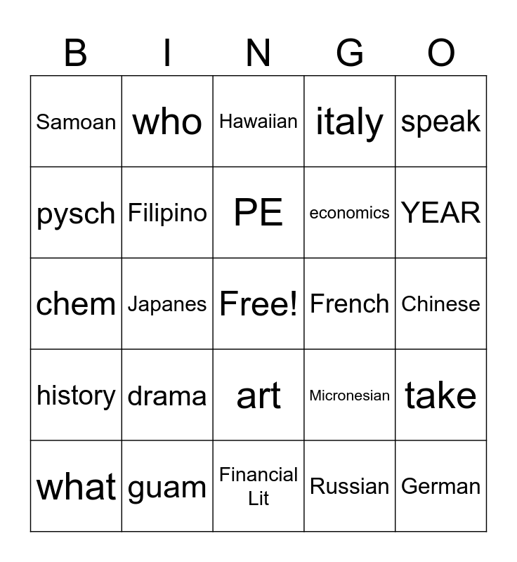 This bingo card has a free space and 31 words: Financial Lit, ASL, Japanes, Math, Samoan, Hawaiian, Filipino, Micronesian, French, Russian, Chinese, German, Music, Science, YEAR, Spanish, take, drama, history, art, speak, English, what, who, economics, pysch, italy, chem, guam, PE and Teach Acad.