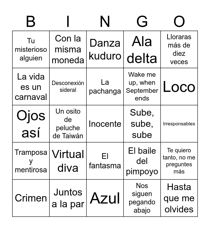 This bingo card has 41 words: Free!, Ojos así, Arrancacorazones, Desconexión sideral, Juntos a la par, El fantasma, La pachanga, Paisaje, Lloraras más de diez veces, Tramposa y mentirosa, Un osito de peluche de Taiwán, Ala delta, Inocente, Irresponsables, Sube, sube, sube, Virtual diva, Atrévete te te, Tu misterioso alguien, Despacito, Danza kuduro, Te quiero tanto, no me preguntes más, Hasta que me olvides, Azul, Wake me up, when September ends, Vuelve, Dejaria todo, Nos siguen pegando abajo, 11 y 6, Loco, Locomia, La colales, Con la misma moneda, Crimen, Persiana americana, El baile del pimpoyo, La vida es un carnaval, Tren del cielo, Suavemente, Vos sabes, Me voy and La quiero a morir.