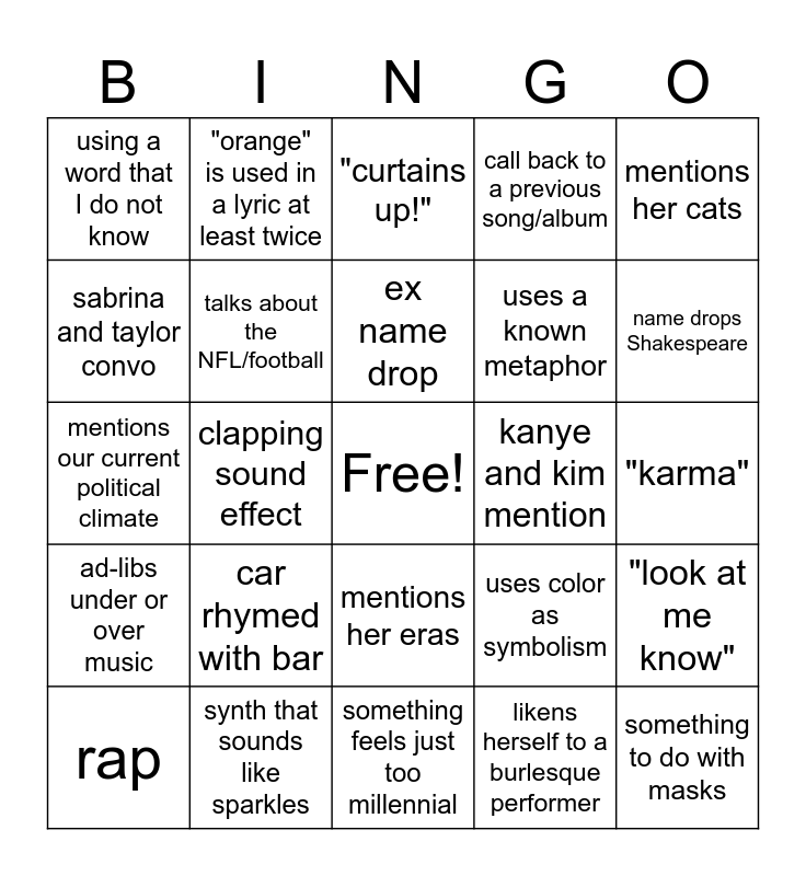 This bingo card has a free space and 24 words: car rhymed with bar, synth that sounds like sparkles, ex name drop, rap, mentions her cats, using a word that I do not know, sabrina and taylor convo, "orange" is used in a lyric at least twice, kanye and kim mention, mentions her eras, uses a known metaphor, mentions our current political climate, uses color as symbolism, "look at me know", talks about the NFL/football, likens herself to a burlesque performer, "karma", "curtains up!", name drops Shakespeare, clapping sound effect, something to do with masks, ad-libs under or over music, call back to a previous song/album and something feels just too millennial.