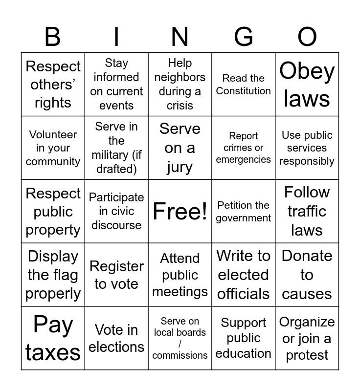 This bingo card has a free space and 24 words: Register to vote, Vote in elections, Serve on a jury, Pay taxes, Obey laws, Respect others’ rights, Volunteer in your community, Stay informed on current events, Petition the government, Attend public meetings, Report crimes or emergencies, Respect public property, Write to elected officials, Donate to causes, Serve in the military (if drafted), Support public education, Follow traffic laws, Help neighbors during a crisis, Use public services responsibly, Participate in civic discourse, Organize or join a protest, Display the flag properly, Read the Constitution and Serve on local boards / commissions.