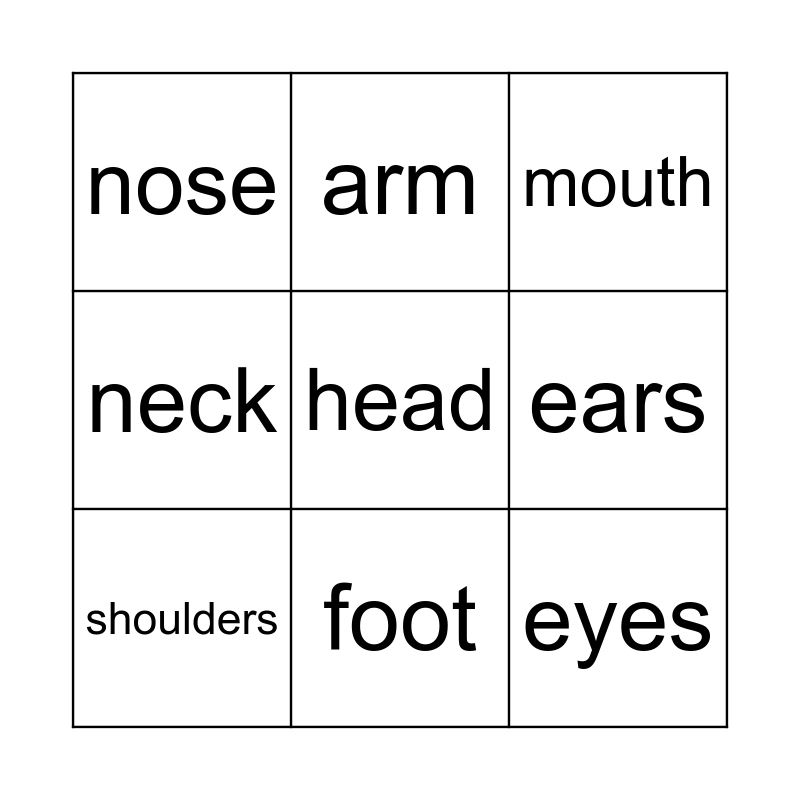 This bingo card has a free space and 12 words: hand, leg, eyes, ears, arm, mouth, foot, eyebrows, nose, neck, shoulders and knees.