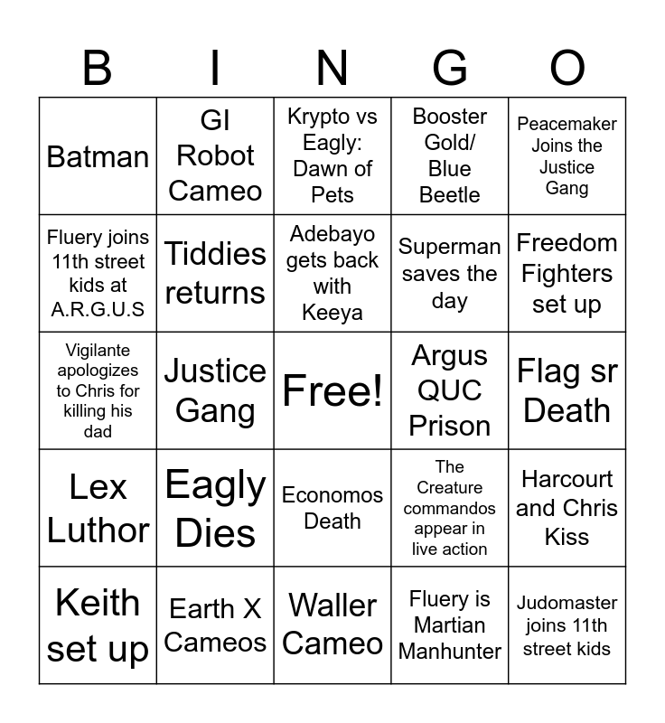 This bingo card has a free space and 24 words: Eagly Dies, Earth X Cameos, Adebayo gets back with Keeya, Keith set up, Peacemaker Joins the Justice Gang, Batman, Fluery joins 11th street kids at A.R.G.U.S, GI Robot Cameo, Argus QUC Prison, Economos Death, Superman saves the day, Vigilante apologizes to Chris for killing his dad, The Creature commandos appear in live action, Harcourt and Chris Kiss, Tiddies returns, Fluery is Martian Manhunter, Flag sr Death, Krypto vs Eagly: Dawn of Pets, Freedom Fighters set up, Justice Gang, Judomaster joins 11th street kids, Lex Luthor, Booster Gold/ Blue Beetle and Waller Cameo.