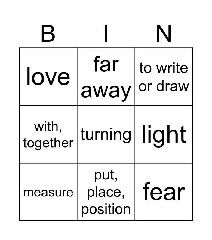 This bingo card has a free space and 8 words: light, to write or draw, far away, measure, love, fear, with, together and put, place, position.