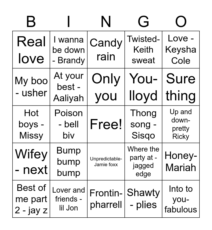 This bingo card has a free space and 29 words: Best of me part 2 - jay z, So gone - Monica, Poison - bell biv, Right here- Swv, Real love, Candy rain, At your best - Aaliyah, Bump bump bump, Thong song - Sisqo, Lover and friends - lil Jon, Up and down- pretty Ricky, Into to you- fabulous, Frontin- pharrell, Shawty - plies, Sure thing, Kiss kiss - Chris brown, Unpredictable- Jamie foxx, Wifey - next, Love -Keysha Cole, Hot boys - Missy, Where the party at - jagged edge, Say my name - Destiny Child, You- lloyd, My boo - usher, Twisted- Keith sweat, I wanna be down - Brandy, Honey- Mariah, Only you and Throw it in the bag.