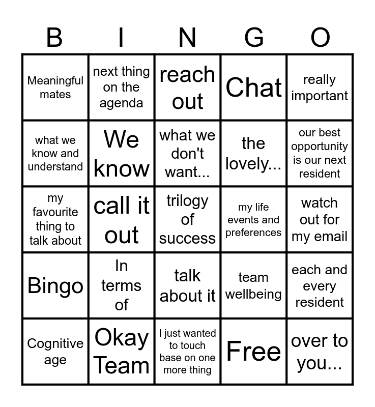 This bingo card has 25 words: In terms of, I just wanted to touch base on one more thing, what we don't want..., Cognitive age, really important, Meaningful mates, what we know and understand, next thing on the agenda, my life events and preferences, talk about it, the lovely..., my favourite thing to talk about, team wellbeing, each and every resident, We know, over to you..., watch out for my email, reach out, our best opportunity is our next resident, call it out, trilogy of success, Okay Team, Bingo, Chat and Free.