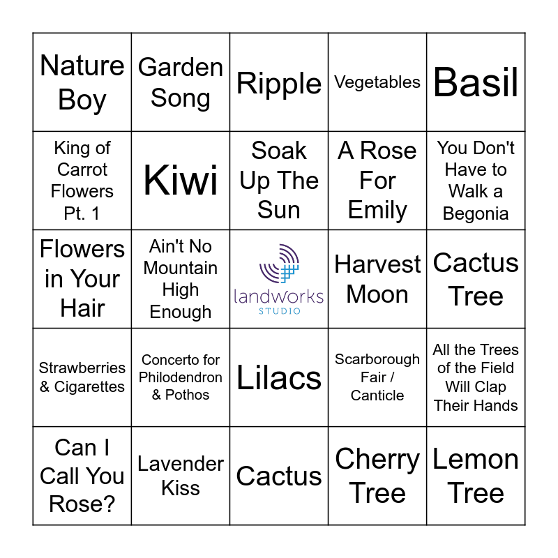 This bingo card has a free space and 71 words: Plantasia, Garden Song, Ivy, Prickly Pear, Cactus, Strawberry Fields Forever, Vegetables, The Gardener, A Rose For Emily, Leaves That Are Green, Can I Call You Rose?, Garden of Eden, You Don't Have to Walk a Begonia, Nature Boy, Flower, Flowers in Your Hair, Scarborough Fair / Canticle, Basil, Prickly Pear, Cactus Tree, Concerto for Philodendron & Pothos, Lemon Tree, All the Trees of the Field Will Clap Their Hands, Mountain Greenery, Roses, peppermint, Watermelon Sugar, Watermelon Man, Lavender, Strawberries, Lavender Kiss, Lotus Flower, Photosynthesis, Dandelion, Cherry Tree, Black Flowers, I'm a Peach, Trees, King of Carrot Flowers Pt. 1, Octopus's Garden, Lilacs, Symphony for a Spider Plant, Strawberries & Cigarettes, Passionfruit, Rosewater, clementine, FLOWER SHOWER, Kiwi, Flowers Never Bend with the Rainfall, Sycamore Silence, Freedom! '90, Sugar Magnolia, Harvest Moon, Lemon Tree, Wildflowers, Here Comes The Sun, Soak Up The Sun, Have You Ever Seen The Rain, Joy To The World, Dancing in the Moonlight, Waterfalls, Lake Of Fire, Ain't No Mountain High Enough, Landslide, Jungle, Mykonos, Ripple, (Nothing But) Flowers, Beds Are Burning, This Land Is Your Land and The Cave.