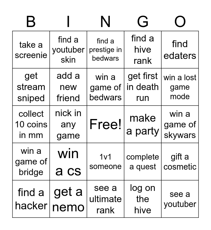 This bingo card has a free space and 24 words: win a cs, get a nemo, win a game of bedwars, find a hacker, find edaters, take a screenie, get stream sniped, find a youtuber skin, make a party, 1v1 someone, get first in death run, collect 10 coins in mm, complete a quest, gift a cosmetic, add a new friend, log on the hive, win a game of skywars, find a prestige in bedwars, win a lost game mode, nick in any game, see a youtuber, win a game of bridge, find a hive rank and see a ultimate rank.