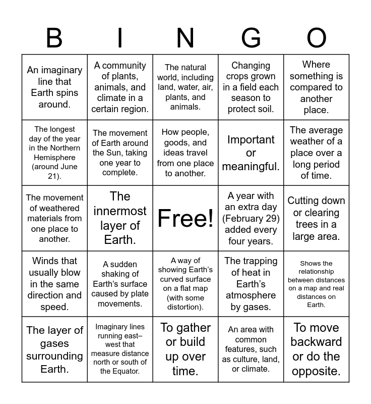 This bingo card has a free space and 83 words: The exact spot on Earth, given by latitude and longitude., Where something is compared to another place., The natural world, including land, water, air, plants, and animals., A period of 10 years., A period of 100 years., A period of 1,000 years., Technology that uses satellites to find exact locations., A system that stores and analyzes map data., A big idea or subject of study in geography., The study of Earth’s natural features, landforms, and processes., The Sun and all the planets, moons, and other objects that orbit it., The curved path an object takes around another object in space., The movement of Earth around the Sun, taking one year to complete., A year with an extra day (February 29) added every four years., The spinning of Earth on its axis., An imaginary line that Earth spins around., The layer of gases surrounding Earth., The longest day of the year in the Northern Hemisphere (around June 21)., The shortest day of the year in the Northern Hemisphere (around December 21)., The time of year when day and night are equal in length., The region between the Tropic of Cancer and the Tropic of Capricorn., Important or meaningful., To move backward or do the opposite., Exactly the same., The innermost layer of Earth., Melted rock found beneath Earth’s crust., The thick layer of rock between Earth’s core and crust., The thin, outermost layer of Earth., A large continuous landmass on Earth., The theory that Earth’s crust is broken into plates that move., A sudden shaking of Earth’s surface caused by plate movements., A crack in Earth’s crust where movement occurs., The breaking down of rocks into smaller pieces., The movement of weathered materials from one place to another., To let out or give off., Staying the same over time., To gather or build up over time., The condition of the air at a certain time and place., The average weather of a place over a long period of time., Winds that usually blow in the same direction and speed., A steady, moving stream of water in the ocean., A climate event where warm water causes unusual weather patterns., A climate event where cooler water causes unusual weather patterns., Winds that blow over small areas., An area that receives little rainfall because mountains block moist air., Areas with similar weather patterns and temperatures., A community of plants, animals, and climate in a certain region., Weather conditions that are affected by cities, such as higher temperatures., Dirty air pollution that forms a thick haze., Rain mixed with harmful chemicals from pollution., The trapping of heat in Earth’s atmosphere by gases., Changing crops grown in a field each season to protect soil., Cutting down or clearing trees in a large area., The careful use of resources to avoid waste., Supplying water to crops through artificial means., A chemical used to kill insects or other pests., A community of living things interacting with their environment., The variety of living things in an ecosystem., Imaginary lines running east–west that measure distance north or south of the Equator., Imaginary lines running north–south that measure distance east or west of the Prime Meridian., The 0° latitude line that divides Earth into the Northern and Southern Hemispheres., The 0° longitude line that divides Earth into the Eastern and Western Hemispheres., The exact spot on Earth, given by latitude and longitude., Where something is compared to another place., Half of the Earth (Northern, Southern, Eastern, or Western)., Shows the relationship between distances on a map and real distances on Earth., A symbol that shows directions (north, south, east, west) on a map., Explains the symbols, colors, and lines used on a map., A map that shows landforms, water, and natural features., A map that shows countries, states, and borders., A map that focuses on one theme, like climate, population, or resources., A 3D model of Earth., A person who makes maps., A way of showing Earth’s curved surface on a flat map (with some distortion)., An area with common features, such as culture, land, or climate., Describes what makes a location unique (landforms, people, culture)., How people adapt to and change their surroundings., How people, goods, and ideas travel from one place to another., Technology that uses satellites to find exact locations., A system that stores and analyzes map data., Location, Place, Region, Movement, and Human-Environment Interaction., The 7 large landmasses on Earth (Africa, Asia, etc.). and The 5 large bodies of salt water on Earth (Pacific, Atlantic, etc.)..