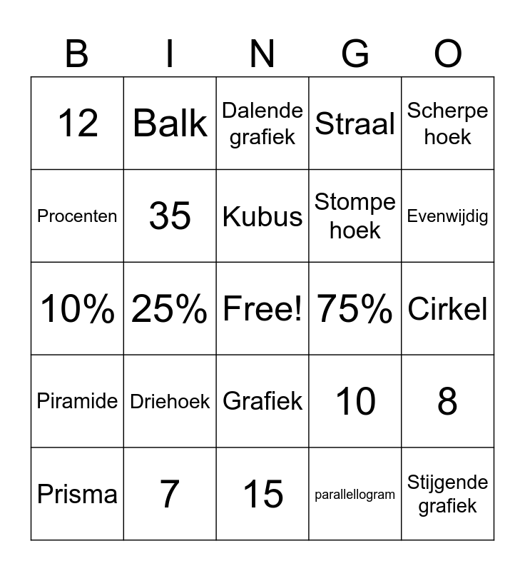 This bingo card has a free space and 36 words: 32, 6, 50%, 35, 10, Piramide, Kubus, Balk, Scherpe hoek, Loodrecht, 25%, Straal, Vierkant, 75%, Evenwijdig, 12, Diameter, Driehoek, Stijgende grafiek, Dalende grafiek, Cirkel, 8, 7, Prisma, 15, Balk, 10%, Cilinder, Stompe hoek, Procenten, 180 graden, 360 graden, parallellogram, Grafiek, Wortel and Kwadraat.