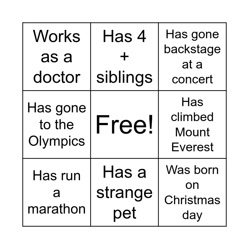 This bingo card has a free space and 8 words: Has climbed Mount Everest, Has gone backstage at a concert, Has 4 + siblings, Has run a marathon, Works as a doctor, Was born on Christmas day, Has gone to the Olympics and Has a strange pet.