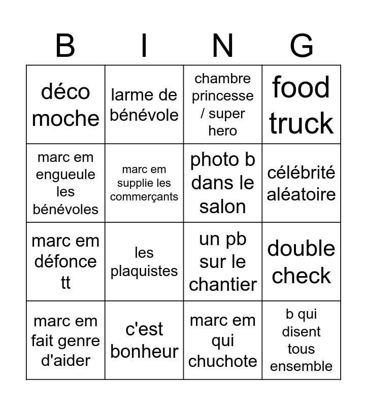 This bingo card has 16 words: c'est bonheur, double check, chambre princesse / super hero, déco moche, marc em défonce tt, larme de bénévole, un pb sur le chantier, marc em qui chuchote, marc em engueule les bénévoles, marc em supplie les commerçants, marc em fait genre d'aider, food truck, les plaquistes, célébrité aléatoire, photo b dans le salon and b qui disent tous ensemble.