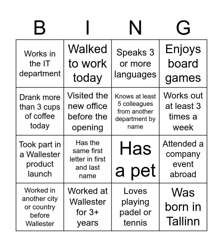 This bingo card has 16 words: Worked at Wallester for 3+ years, Attended a company event abroad, Speaks 3 or more languages, Works in the IT department, Took part in a Wallester product launch, Walked to work today, Has a pet, Loves playing padel or tennis, Drank more than 3 cups of coffee today, Visited the new office before the opening, Worked in another city or country before Wallester, Enjoys board games, Has the same first letter in first and last name, Works out at least 3 times a week, Knows at least 5 colleagues from another department by name and Was born in Tallinn.
