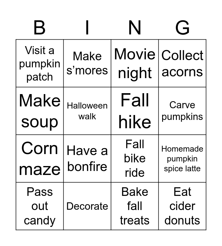 This bingo card has 16 words: Decorate, Homemade pumpkin spice latte, Movie night, Visit a pumpkin patch, Corn maze, Make s’mores, Fall bike ride, Bake fall treats, Make soup, Halloween walk, Pass out candy, Collect acorns, Have a bonfire, Carve pumpkins, Fall hike and Eat cider donuts.