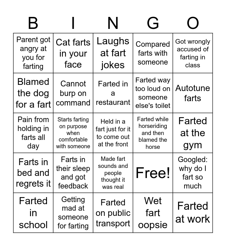 This bingo card has 25 words: Farts in their sleep and got feedback, Farted on public transport, Farted in a restaurant, Farted in school, Got wrongly accused of farting in class, Parent got angry at you for farting, Blamed the dog for a fart, Cat farts in your face, Farted while horseriding and then blamed the horse, Made fart sounds and people thought it was real, Farted way too loud on someone else's toilet, Pain from holding in farts all day, Free!, Googled: why do I fart so much, Cannot burp on command, Farted at work, Farted at the gym, Laughs at fart jokes, Autotune farts, Starts farting on purpose when comfortable with someone, Held in a fart just for it to come out at the front, Getting mad at someone for farting, Farts in bed and regrets it, Compared farts with someone and Wet fart oopsie.