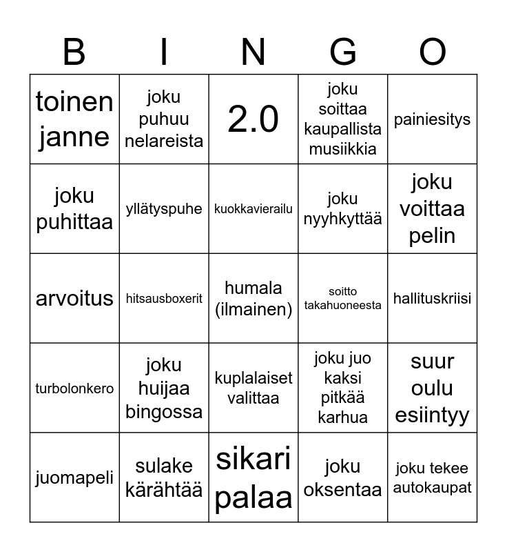 This bingo card has a free space and 24 words: joku huijaa bingossa, sulake kärähtää, kuokkavierailu, juomapeli, painiesitys, toinen janne, joku puhittaa, joku puhuu nelareista, soitto takahuoneesta, kuplalaiset valittaa, joku nyyhkyttää, arvoitus, joku juo kaksi pitkää karhua, suur oulu esiintyy, yllätyspuhe, joku oksentaa, hallituskriisi, 2.0, joku voittaa pelin, hitsausboxerit, joku tekee autokaupat, turbolonkero, joku soittaa kaupallista musiikkia and sikari palaa.