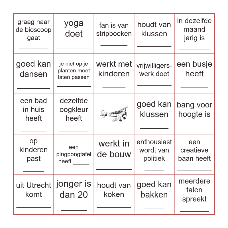 This bingo card has a free space and 56 words: houdt van planten ________, uit Utrecht komt ________, dezelfde sport doet als jij ________, graag naar de bioscoop gaat ________, houdt van koken ________, niet in dezelfde flat woont ________, je niet op je planten moet laten passen ___________, professioneel kok is (geweest) ______, vrijwilligers-werk doet _________, huisdieren heeft ________, houdt van klussen ________, geen huisgenoten heeft _________, op vakantie in NL is geweest _________, horeca-ervaring heeft ________, houdt van nagels lakken _______, een naam heeft met 5 letters ________, in dezelfde maand jarig is ________, dezelfde oogkleur heeft _______, hetzelfde boek heeft gelezen _______, meerdere talen spreekt _______, goed kan klussen ______, doet vrijwilligerswerk _____, enthousiast wordt van politiek _____, fan is van stripboeken _______, je niet op je kinderen moet laten passen ______, werkt met kinderen _____, op school zit / student is _____, muziek speelt / maakt _______, een busje heeft ______, meer dan 20 jaar getrouwd is ______, geboren is buiten NL _______, vanuit huis werkt ______, allergisch voor dieren is _____, werkt in gezondheids-zorg _____, bang voor hoogte is ______, goed kan dansen _______, een bad in huis heeft ______, geen vlees eet _____, op kinderen past _____, yoga doet _______, werkt in de bouw _______, vrijgezel is _______, is gepensioneerd _____, een eigen bedrijf heeft _____, een groene trui aan heeft ____, een pingpongtafel heeft _____, jonger is dan 20 _____, op zwemles zit _____, de volgende BBQ organiseert _____, van pittig eten houdt ____, goed kan bakken ____, een teamsport doet _____, niet van chocola houdt ____, houdt van wandelvakanties ______, een creatieve baan heeft _________ and uit Noord-Holland komt ________.