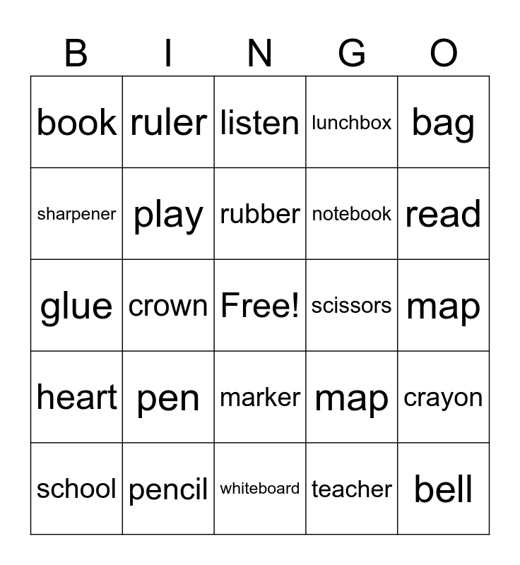This bingo card has a free space and 24 words: pen, pencil, rubber, school, bag, book, sharpener, ruler, scissors, marker, notebook, glue, map, crayon, play, teacher, map, listen, read, crown, bell, heart, lunchbox and whiteboard.