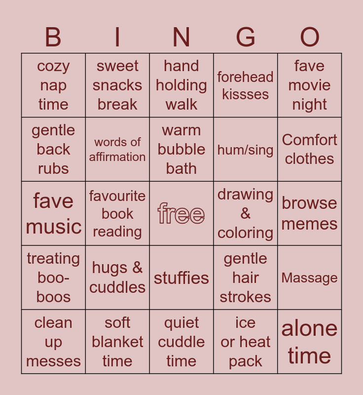 This bingo card has a free space and 24 words: hugs & cuddles, soft blanket time, warm bubble bath, clean up messes, fave movie night, cozy nap time, gentle back rubs, sweet snacks break, drawing & coloring, stuffies, hum/sing, fave music, gentle hair strokes, Massage, words of affirmation, ice or heat pack, browse memes, hand holding walk, Comfort clothes, favourite book reading, alone time, treating boo-boos, forehead kissses and quiet cuddle time.