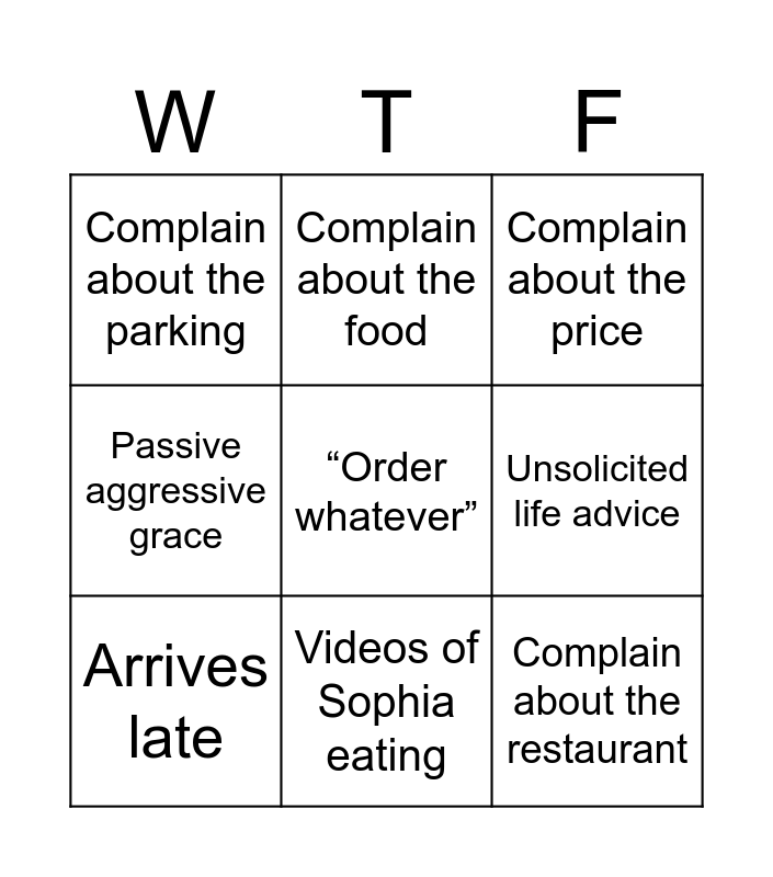 This bingo card has a free space and 8 words: Unsolicited life advice, Complain about the price, Complain about the food, Arrives late, Complain about the parking, Complain about the restaurant, Passive aggressive grace and Videos of Sophia eating.