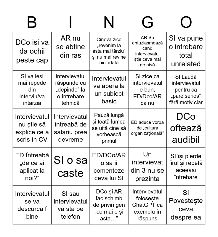 This bingo card has a free space and 24 words: SI o sa caste, SI sau intervievatul va sta pe telefon, Intervievatul va abera la un subiect basic, Intervievatul se va descurca f bine, SI va pune o intrebare total unrelated, DCo isi va da ochii peste cap, SI va iesi mai repede din interviu/va intarzia, AR nu se abtine din ras, ED aduce vorba de „cultura organizațională”, ED/DCo/AR o sa ii comenteze ceva lui SI, SI zice ca intervievatul e bun, ED/Dco/AR ca nu, Intervievatul nu știe să explice ce a scris în CV, Un intervievat din 3 nu se prezinta, SI își pierde firul și repetă aceeași întrebare, Intervievatul răspunde cu „depinde” la o întrebare tehnică, Intervievatul folosește ChatGPT ca exemplu în răspuns, DCo oftează audibil, Cineva zice „revenim la asta mai târziu” și nu mai revine niciodată, SI Laudă intervievatul pentru că „pare serios” fără motiv clar, Intervievatul întreabă de salariu prea devreme, SI Povestește ceva despre ea, ED Întreabă „de ce ai aplicat la noi?”, AR Se entuziasmează când intervievatul știe ceva mai de nișă and DCo și AR fac schimb de priviri gen „ce mai e și asta…”.
