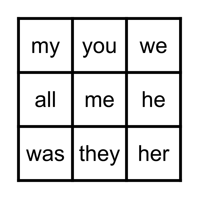 This bingo card has a free space and 8 words: he, we, you, was, my, her, all and they.