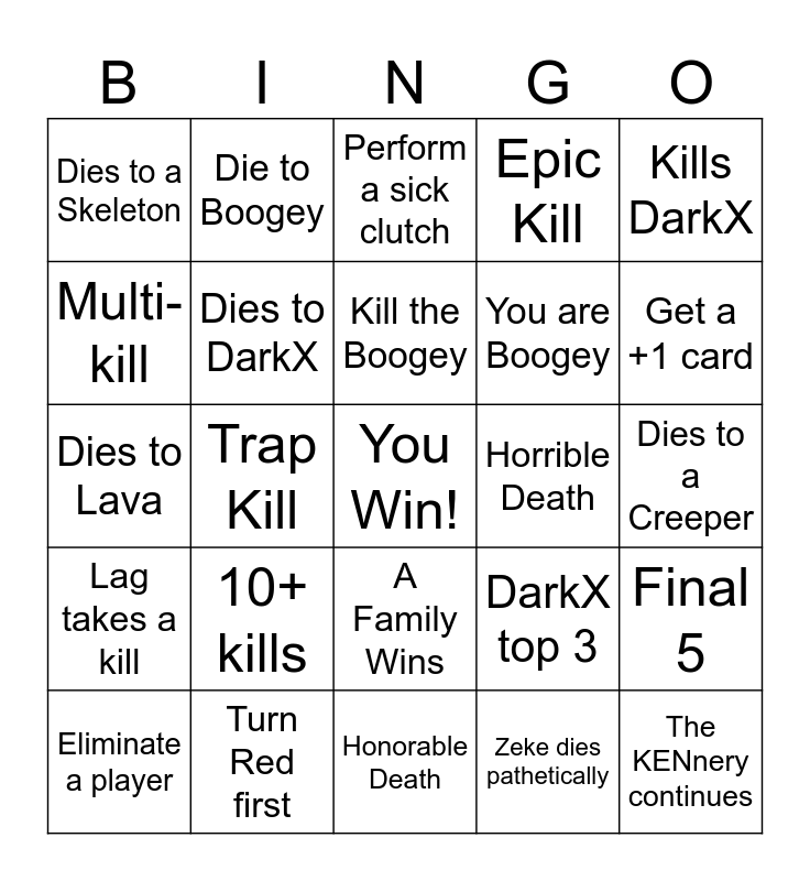 This bingo card has a free space and 24 words: 10+ kills, Turn Red first, Kill the Boogey, Eliminate a player, Kills DarkX, Dies to a Skeleton, Multi-kill, Die to Boogey, Horrible Death, A Family Wins, You are Boogey, Dies to Lava, DarkX top 3, Final 5, Dies to DarkX, Zeke dies pathetically, Dies to a Creeper, Perform a sick clutch, Get a +1 card, Trap Kill, The KENnery continues, Lag takes a kill, Epic Kill and Honorable Death.