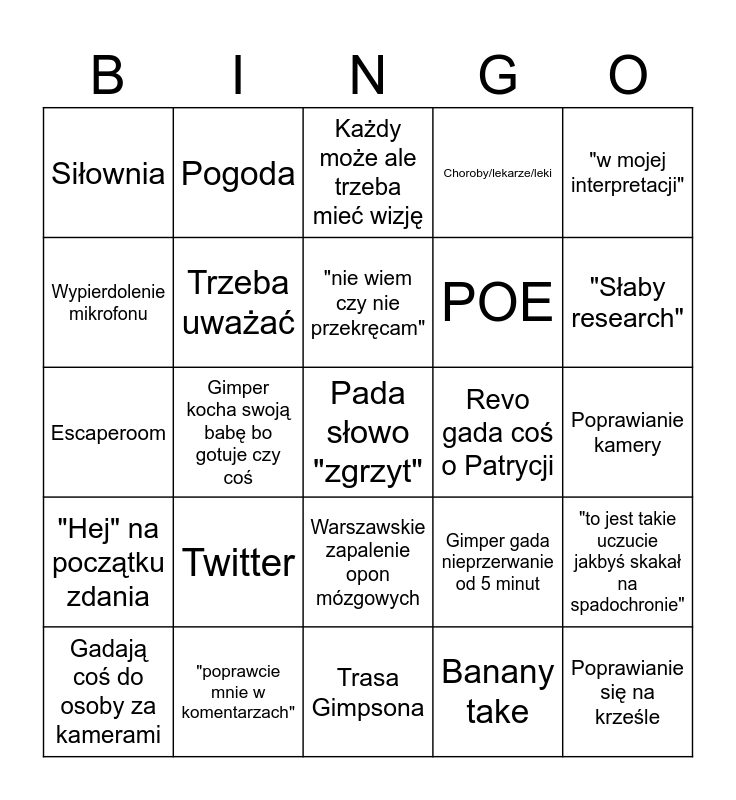 This bingo card has a free space and 38 words: Dopamina, Adwokat diabła, Kot kaktus, Trzeba uważać, "to jest takie uczucie jakbyś skakał na spadochronie", Twitter, "nie wiem czy nie przekręcam", Podatki, "w mojej interpretacji", POE, Gimper kocha swoją babę bo gotuje czy coś, Choroby/lekarze/leki, Poprawianie się na krześle, Poprawianie kamery, Wypierdolenie mikrofonu, "Hej" na początku zdania, Revo pierdoli, Każdy może ale trzeba mieć wizję, Remont/dom, Revo gada coś o Patrycji, Siłownia, "poprawcie mnie w komentarzach", "Słaby research", Gadają coś do osoby za kamerami, Teść, Trasa Gimpsona, Revo wyszedł z domu, "nie wiem czy to już było na Zgrzycie, ale", "to może być kontrowersyjny także, ale", Co u Pasuta?, Co u Gonciarza?, Warszawskie zapalenie opon mózgowych, Banany take, Pogoda, Gimper gada coś o anime, Gimper gada nieprzerwanie od 5 minut, Escaperoom and Pozew.