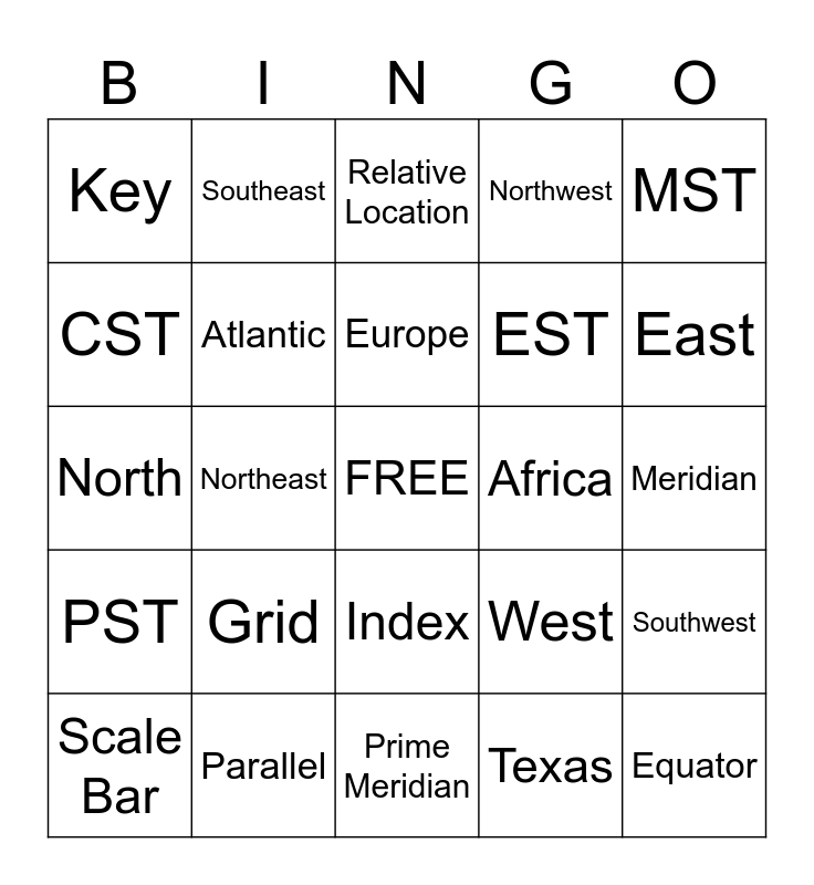 This bingo card has a free space and 29 words: Scale Bar, Asia, Northeast, Compass Rose, Key, Relative Location, Atlantic, Grid, Africa, Parallel, Meridian, Equator, Prime Meridian, Texas, East, South, Index, PST, MST, North, West, Time Zone, EST, CST, Northwest, Southeast, Southwest, Europe and Antarctica.