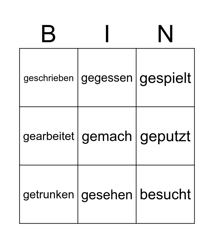 This bingo card has 18 words: gekocht, geschlafen, gespielt, geschrieben, besucht, gearbeitet, gelernt, gegessen, gesehen, besucht, gelesen, gemach, gefahren, geputzt, getrunken, gehabt, gelauft and geträumt.