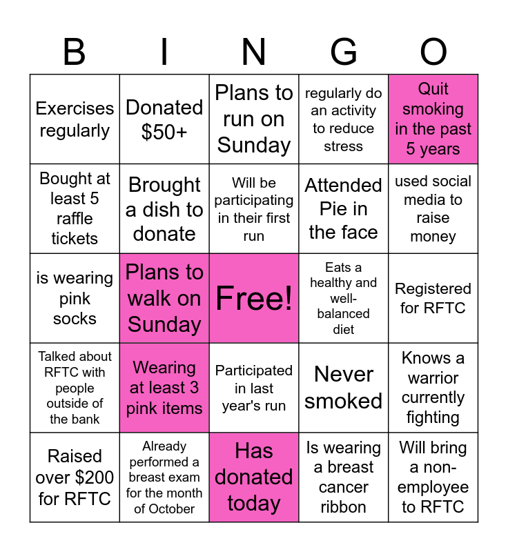 This bingo card has a free space and 24 words: Wearing at least 3 pink items, Already performed a breast exam for the month of October, Will be participating in their first run, Raised over $200 for RFTC, Quit smoking in the past 5 years, Exercises regularly, Bought at least 5 raffle tickets, Donated $50+, Eats a healthy and well-balanced diet, Participated in last year's run, Attended Pie in the face, is wearing pink socks, Never smoked, Knows a warrior currently fighting, Brought a dish to donate, Is wearing a breast cancer ribbon, Registered for RFTC, Plans to run on Sunday, used social media to raise money, Plans to walk on Sunday, Will bring a non-employee to RFTC, Talked about RFTC with people outside of the bank, regularly do an activity to reduce stress and Has donated today.