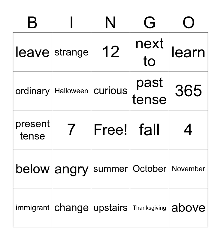 This bingo card has a free space and 24 words: angry, change, curious, immigrant, learn, leave, ordinary, strange, fall, summer, past tense, present tense, October, November, Halloween, Thanksgiving, 4, 12, 365, 7, above, below, next to and upstairs.