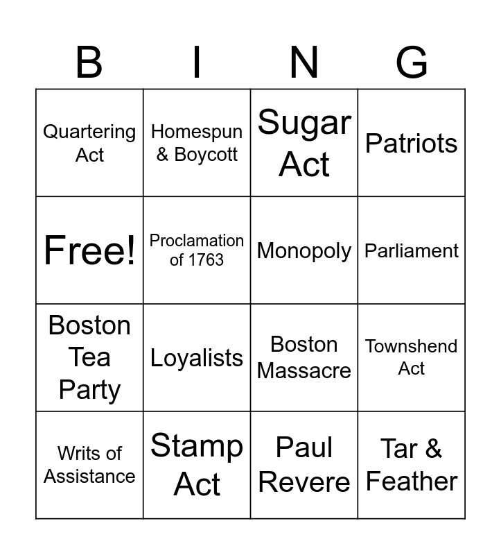 This bingo card has 16 words: Stamp Act, Townshend Act, Sugar Act, Quartering Act, Boston Tea Party, Homespun & Boycott, Boston Massacre, Paul Revere, Free!, Proclamation of 1763, Writs of Assistance, Patriots, Loyalists, Parliament, Monopoly and Tar & Feather.
