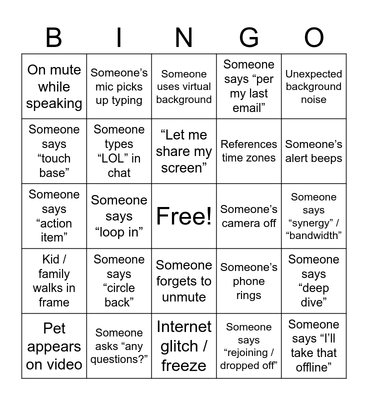 This bingo card has a free space and 25 words: Someone says “circle back”, Internet glitch / freeze, “Let me share my screen”, Pet appears on video, Unexpected background noise, On mute while speaking, Someone says “touch base”, Someone’s mic picks up typing, Someone’s camera off, Someone forgets to unmute, References time zones, Someone says “action item”, Someone’s phone rings, Someone says “deep dive”, Someone types “LOL” in chat, Someone’s pet barks, Someone says “synergy” / “bandwidth”, Someone uses virtual background, Someone’s alert beeps, Someone says “loop in”, Someone says “I’ll take that offline”, Someone asks “any questions?”, Kid / family walks in frame, Someone says “per my last email” and Someone says “rejoining / dropped off”.