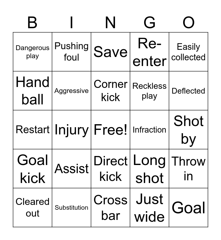 This bingo card has a free space and 26 words: Direct kick, Just wide, Corner kick, Substitution, Easily collected, Dangerous play, Hand ball, Pushing foul, Shot by, Long shot, Reckless play, Restart, Throw in, Cleared out, Injury, Thru ball, Re-enter, Goal kick, Save, Goal, Deflected, Cross bar, Infraction, Assist, Aggressive and Headed.
