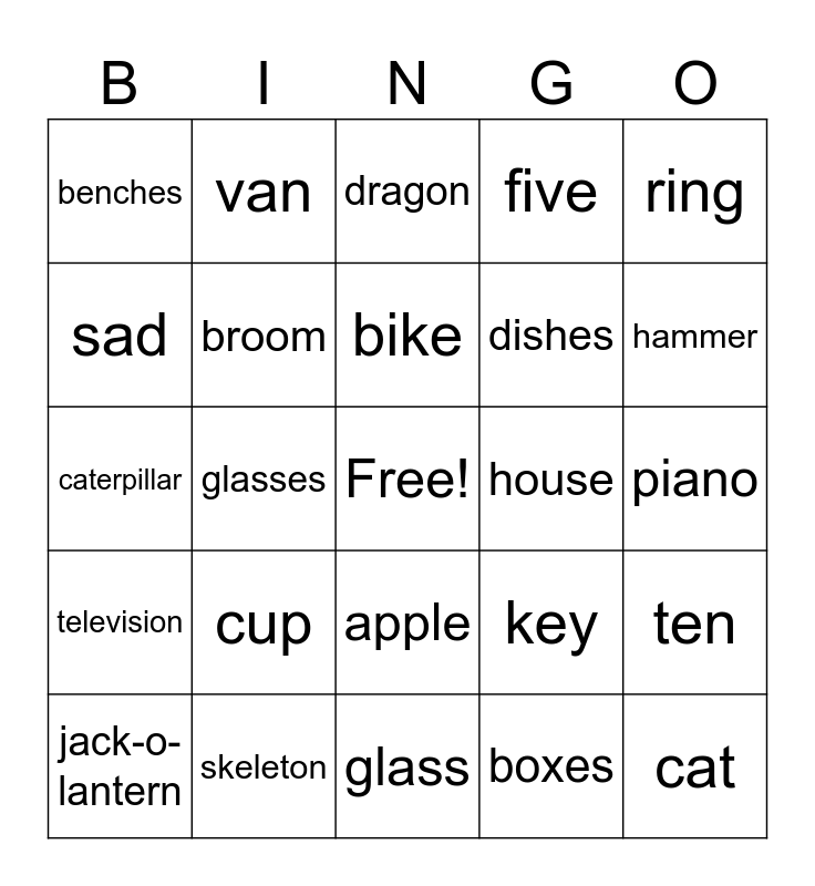 This bingo card has a free space and 50 words: dog, cat, frog, glass, cup, plate, van, ball, sad, clock, broom, five, ten, key, mask, bird, bike, house, book, ring, glasses, boxes, benches, dishes, candle, donut, hammer, mushroom, dragon, apple, bathtub, parade, butterfly, grasshopper, skeleton, tomato, garbage can, hamburger, calendar, piano, valentine, watermelon, elevator, jack-in-the-box, jack-o-lantern, caterpillar, thermometer, volcano, television and octopus.