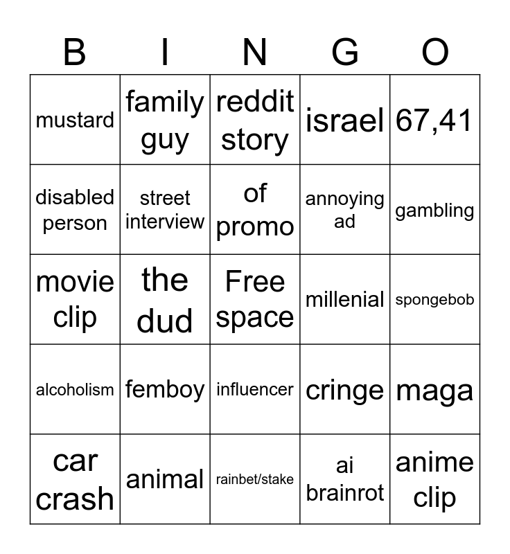 This bingo card has a free space and 24 words: car crash, femboy, of promo, ai brainrot, 67,41, mustard, family guy, reddit story, millenial, spongebob, movie clip, street interview, cringe, maga, disabled person, animal, rainbet/stake, israel, gambling, alcoholism, the dud, influencer, annoying ad and anime clip.