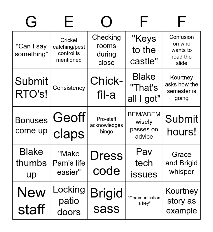 This bingo card has a free space and 39 words: "For students by students", Cleaning the study rooms, Feedback on the BEM phone, Consistency, New staff, Dress code, Chick-fil-a, Geoff says his usual lines to mess with us, Confusion on who wants to read the slide, Blake thumbs up, Geoff claps, "Keys to the castle", Kourtney story as example, Submit hours!, BEM/ABEM wisely passes on advice, "Make Pam's life easier", Entire room is quiet when Kourtney asks for comments, "Can I say something", Wilks tech is broken, Pav tech issues, Submit RTO's!, Brigid sass, Blake "That's all I got", Kourtney asks how the semester is going, Grace makes eye contact for an uncomfortable amount of time, Airtags on keys/taking keys home, Sarah is dismissed from discussion, Mention the missing BEMs who usually talk, Kourtney's plants, Cricket catching/pest control is mentioned, Closing announcements, Grace threatens to separate Kaleigh and Brytni, Checking rooms during close, Locking patio doors, "Communication is key", Redzone, Grace and Brigid whisper, Bonuses come up and Geoff wants to pay us more but HR said no.