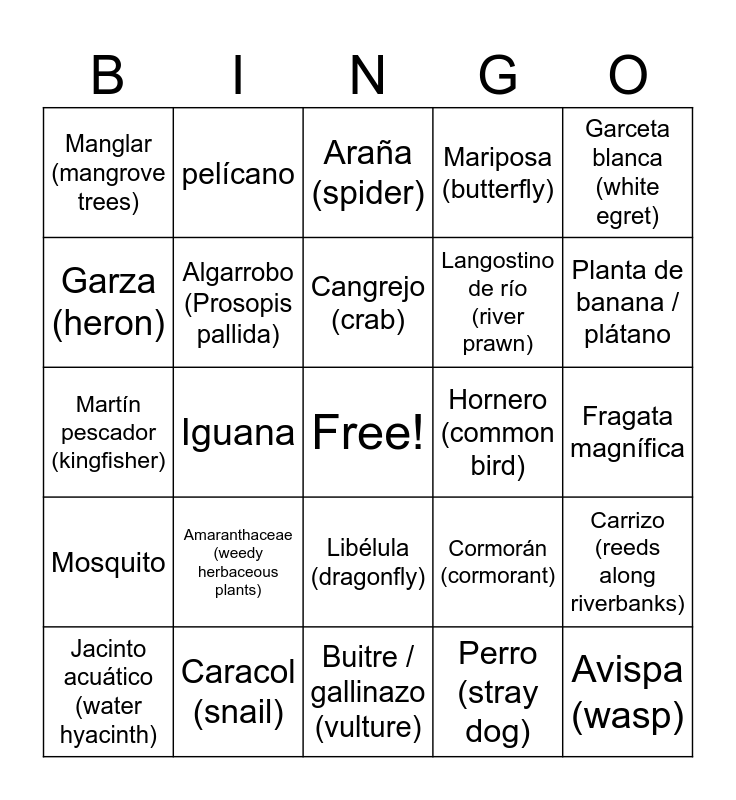 This bingo card has a free space and 26 words: Libélula (dragonfly), Perro (stray dog), Cangrejo (crab), Caracol (snail), Garceta blanca (white egret), Manglar (mangrove trees), Garza (heron), pelícano, Fragata magnífica, Cormorán (cormorant), Langostino de río (river prawn), Martín pescador (kingfisher), Carrizo (reeds along riverbanks), Jacinto acuático (water hyacinth), Iguana, Lagarto (small lizards), Mariposa (butterfly), Mosquito, Araña (spider), Avispa (wasp), Planta de banana / plátano, Buitre / gallinazo (vulture), Hornero (common bird), Amaranthaceae (weedy herbaceous plants), Algarrobo (Prosopis pallida) and Pez (fish).