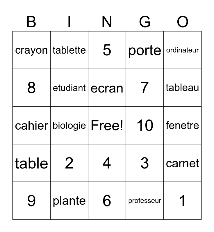 This bingo card has a free space and 24 words: 2, plante, ecran, 9, ordinateur, crayon, 8, tablette, 10, 4, 7, cahier, 3, carnet, etudiant, professeur, fenetre, 5, tableau, biologie, 1, table, porte and 6.