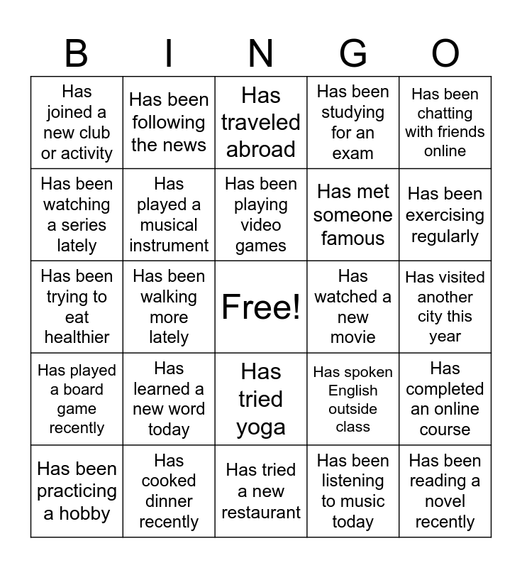 This bingo card has a free space and 25 words: Has learned a new word today, Has tried a new restaurant, Has been playing video games, Has been practicing a hobby, Has been chatting with friends online, Has joined a new club or activity, Has been watching a series lately, Has been following the news, Has watched a new movie, Has tried yoga, Has met someone famous, Has been trying to eat healthier, Has spoken English outside class, Has completed an online course, Has played a musical instrument, Has eaten sushi, Has visited another city this year, Has traveled abroad, Has been exercising regularly, Has been walking more lately, Has been reading a novel recently, Has cooked dinner recently, Has played a board game recently, Has been studying for an exam and Has been listening to music today.