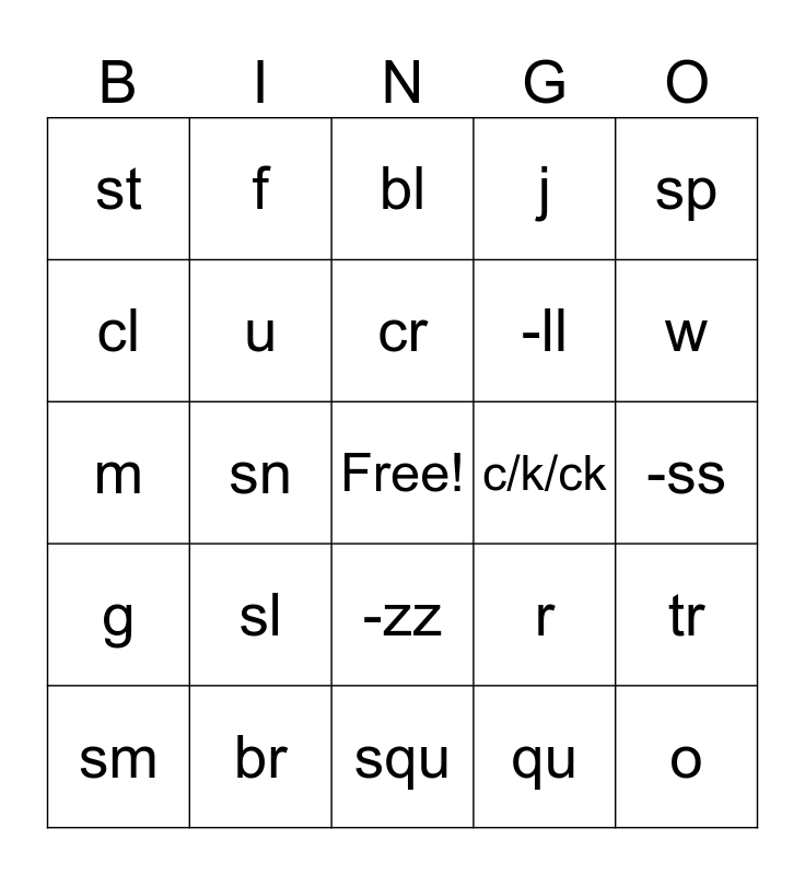 This bingo card has a free space and 24 words: sl, br, cr, sm, sp, st, cl, f, c/k/ck, -zz, -ll, m, r, tr, u, qu, -ss, bl, w, sn, o, g, j and squ.