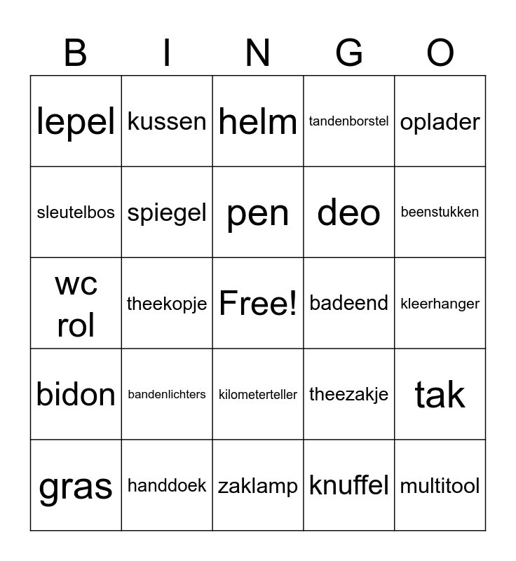 This bingo card has a free space and 29 words: bal, handdoek, helm, bril, oplader, lepel, spiegel, pen, badeend, tak, gras, theekopje, knuffel, multitool, wc rol, begleider, zaklamp, theezakje, beenstukken, bidon, bandenlichters, schoenen, deo, kleerhanger, sleutelbos, kussen, kilometerteller, tandenborstel and zak snoep.
