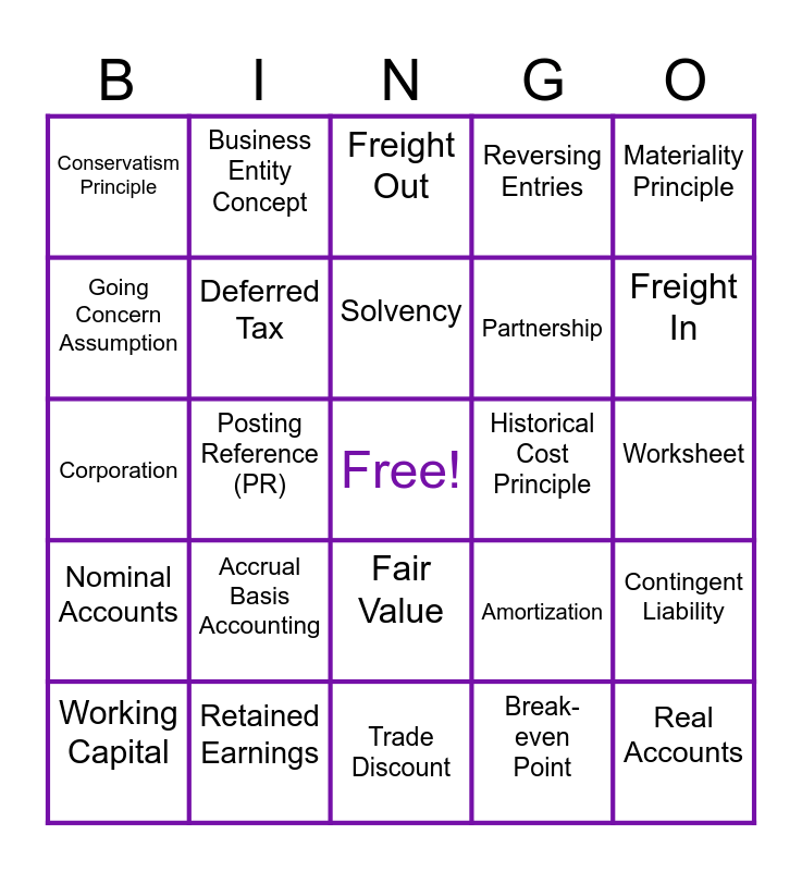 This bingo card has a free space and 24 words: Accrual Basis Accounting, Retained Earnings, Solvency, Working Capital, Materiality Principle, Conservatism Principle, Going Concern Assumption, Business Entity Concept, Historical Cost Principle, Fair Value, Partnership, Corporation, Amortization, Contingent Liability, Deferred Tax, Break-even Point, Worksheet, Freight Out, Freight In, Posting Reference (PR), Real Accounts, Nominal Accounts, Reversing Entries and Trade Discount.
