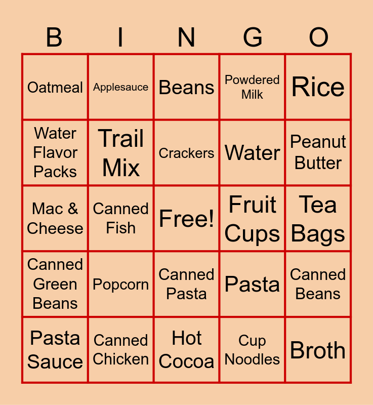 This bingo card has a free space and 34 words: Canned Corn, Cup Noodles, Dried Fruit, Cereal, Canned Green Beans, Trail Mix, Rice, Pasta Sauce, Applesauce, Canned Fruit, Crackers, Beans, Instant Rice, Stuffing, Fruit Cups, Peanut Butter, Canned Chicken, Mac & Cheese, Popcorn, Pasta, Canned Pasta, Granola, Oatmeal, Tea Bags, Hot Cocoa, Broth, Powdered Milk, Protein Bars, Water, Water Flavor Packs, Instant Pasta, Canned Fish, Canned Beans and Grits.
