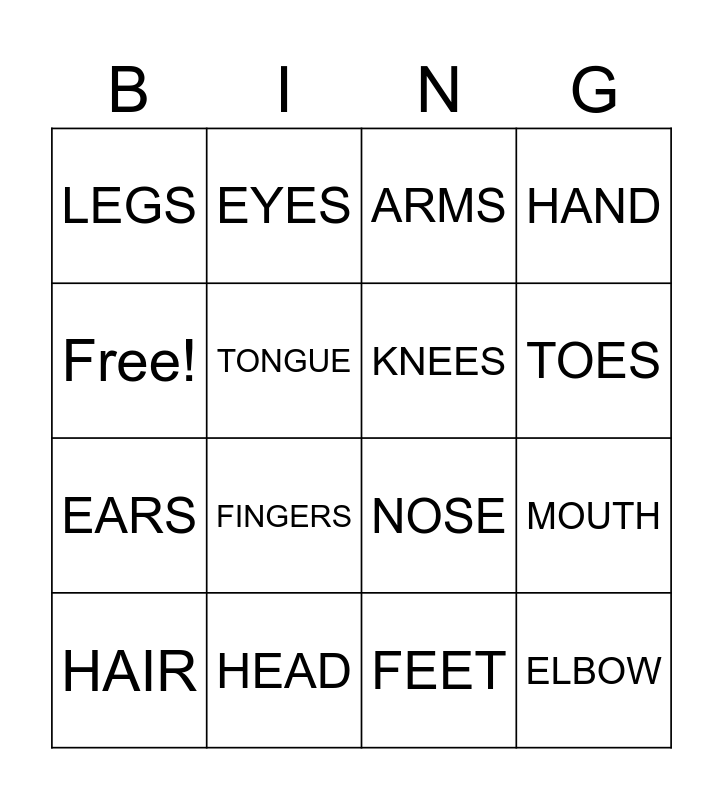 This bingo card has 16 words: HEAD, MOUTH, ARMS, LEGS, EARS, EYES, NOSE, FEET, Free!, TONGUE, HAIR, HAND, FINGERS, TOES, KNEES and ELBOW.