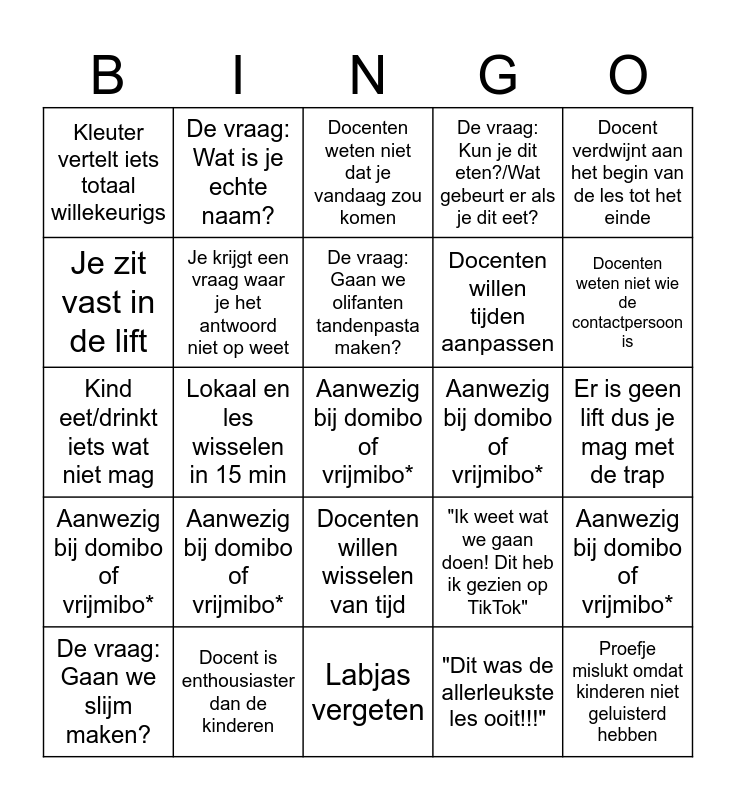 This bingo card has a free space and 24 words: De vraag: Gaan we slijm maken?, Aanwezig bij domibo of vrijmibo*, De vraag: Gaan we olifanten tandenpasta maken?, "Dit was de allerleukste les ooit!!!", Docent verdwijnt aan het begin van de les tot het einde, Kleuter vertelt iets totaal willekeurigs, De vraag: Wat is je echte naam?, Docenten weten niet dat je vandaag zou komen, Aanwezig bij domibo of vrijmibo*, Er is geen lift dus je mag met de trap, Kind eet/drinkt iets wat niet mag, Je krijgt een vraag waar je het antwoord niet op weet, "Ik weet wat we gaan doen! Dit heb ik gezien op TikTok", Aanwezig bij domibo of vrijmibo*, Je zit vast in de lift, Docent is enthousiaster dan de kinderen, Labjas vergeten, De vraag: Kun je dit eten?/Wat gebeurt er als je dit eet?, Docenten weten niet wie de contactpersoon is, Aanwezig bij domibo of vrijmibo*, Lokaal en les wisselen in 15 min, Docenten willen wisselen van tijd, Docenten willen tijden aanpassen and Proefje mislukt omdat kinderen niet geluisterd hebben.