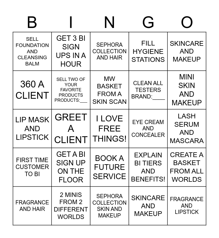 This bingo card has a free space and 24 words: GET A BI SIGN UP ON THE FLOOR, 2 MINIS FROM 2 DIFFERENT WORLDS, MW BASKET FROM A SKIN SCAN, FRAGRANCE AND HAIR, SKINCARE AND MAKEUP, SELL FOUNDATION AND CLEANSING BALM, 360 A CLIENT, GET 3 BI SIGN UPS IN A HOUR, EYE CREAM AND CONCEALER, BOOK A FUTURE SERVICE, CLEAN ALL TESTERS BRAND:____, LIP MASK AND LIPSTICK, EXPLAIN BI TIERS AND BENEFITS!, CREATE A BASKET FROM ALL WORLDS, SELL TWO OF YOUR FAVORITE PRODUCTS PRODUCTS:___, SKINCARE AND MAKEUP, LASH SERUM AND MASCARA, SEPHORA COLLECTION AND HAIR, MINI SKIN AND MAKEUP, GREET A CLIENT, FRAGRANCE AND LIPSTICK, FIRST TIME CUSTOMER TO BI, FILL HYGIENE STATIONS and SEPHORA COLLECTION SKIN AND MAKEUP.