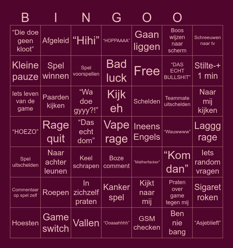 This bingo card has a free space and 48 words: Kijkt naar mij, “DAS ECHT BULLSHIT”, “Ooaaahhhh”, Rage quit, “Wa doe gyyy?!”, Laggg rage, Afgeleid, Game switch, Boos wijzen naar scherm, Boze comment, Schreeuwen naar tv, “HOPPAAAA”, Teammate uitschelden, Schelden, Commentaar op spel zelf, “Wauwwww”, Kleine pauze, Stilte-+ 1 min, Praten over game tegen mij, Gaan liggen, Free, “Das echt dom”, “Die doe geen kloot”, Spel winnen, Sigaret roken, Spel voorspellen, Naar mij kijken, Hoesten, Kijk eh, Paarden kijken, Ben nie bang, Ineens Engels, Iets random vragen, Roepen, “HOEZO”, “Matherfacker”, “Kom dan”, Iets leven van de game, Keel schrapen, In zichzelf praten, Spel uitschelden, “Asjeblieft”, “Hihi”, Vallen, Bad luck, Kanker spel, Naar achter leunen and GSM checken.