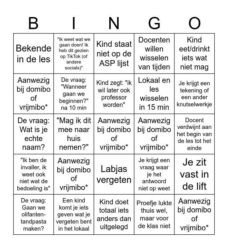 This bingo card has a free space and 24 words: De vraag: Gaan we olifanten-tandpasta maken?, Aanwezig bij domibo of vrijmibo*, Kind zegt: "ik wil later ook professor worden", Proefje lukte thuis wel, maar voor de klas niet, Kind eet/drinkt iets wat niet mag, Bekende in de les, "Ik weet wat we gaan doen! Ik heb dit gezien op TikTok (of andere socials)", Kind staat niet op de ASP lijst, Aanwezig bij domibo of vrijmibo*, Docent verdwijnt aan het begin van de les tot het einde, De vraag: Wat is je echte naam?, De vraag: "Wanneer gaan we beginnen?" na 10 min, Je krijgt een vraag waar je het antwoord niet op weet, Je zit vast in de lift, Aanwezig bij domibo of vrijmibo*, Een kind komt je iets geven wat je vergeten bent in het lokaal, Kind doet totaal iets anders dan uitgelegd, Docenten willen wisselen van tijden, Je krijgt een tekening of een ander knutselwerkje, "Ik ben de invaller, ik weet ook niet wat de bedoeling is", "Mag ik dit mee naar huis nemen?", Labjas vergeten, Lokaal en les wisselen in 15 min and Aanwezig bij domibo of vrijmibo*.