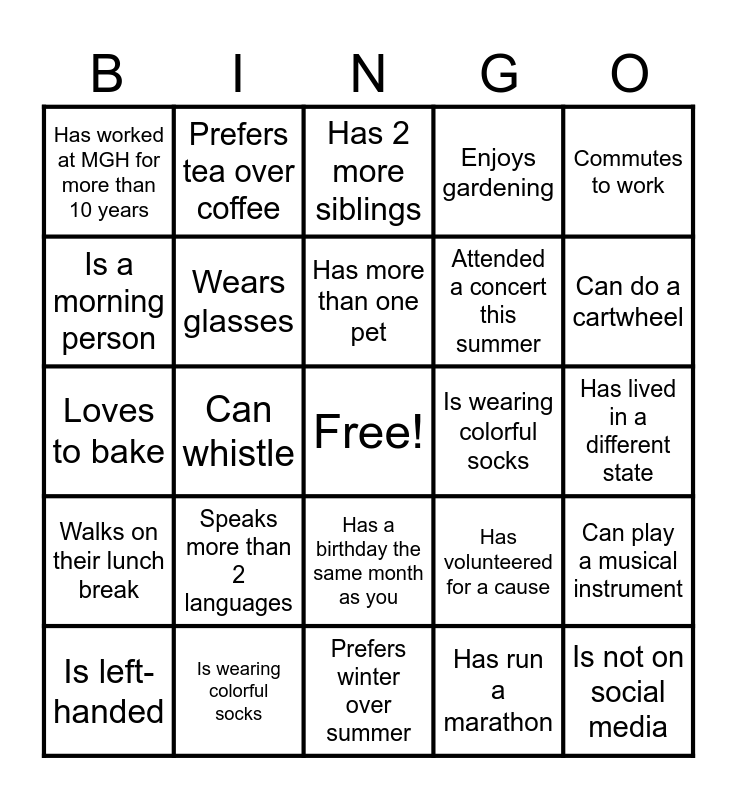 This bingo card has a free space and 24 words: Speaks more than 2 languages, Is wearing colorful socks, Has more than one pet, Is left-handed, Commutes to work, Has worked at MGH for more than 10 years, Is a morning person, Prefers tea over coffee, Is wearing colorful socks, Has a birthday the same month as you, Attended a concert this summer, Loves to bake, Has volunteered for a cause, Can play a musical instrument, Wears glasses, Has run a marathon, Has lived in a different state, Has 2 more siblings, Can do a cartwheel, Can whistle, Is not on social media, Walks on their lunch break, Enjoys gardening and Prefers winter over summer.